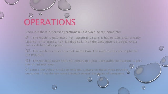 Add states - which concatenate a character onto the right end of the string in STORE. This is different from PDA PUSH states, which concatenate characters onto the left. Post machines have no PUSH states. No branching can take place at an ADD state.